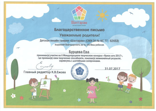 2017 г. - II Международный конкурс декоративно-прикладного творчества и изобразительного искусства «Яркое лето 2017» детской онлайн-галереи «Шантарам», июль, диплом за III место, Бурцевой Евы;