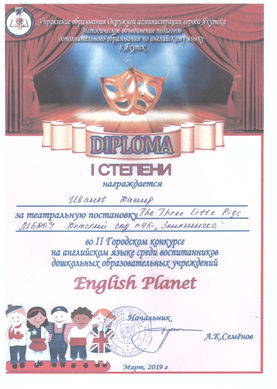 2019 г. - II Городской конкурс на английском языке среди воспитанников дошкольных образовательных учреждений "English Planet" - диплом I степени, сказка "Three Little Pigs", диплом участника Иванов Дамир, март;
